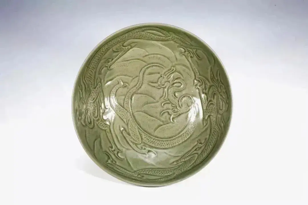 “巧剜明月染绿水,清旋薄冰盛绿云。”纹饰中,三条游龙,跃动于春水绿云之间。