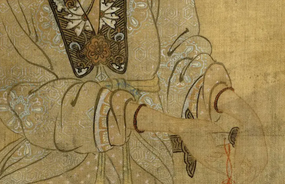 ▲唐 阎立本 《步辇图》故宫博物院藏。女子手腕处戴的跳脱。