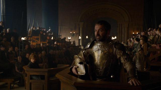 艾丽娅装扮成卖牡蛎的小商贩乘机收集情报,就在这时候她偶然看到梅斯.提利尔带着他的随从马林.特兰。