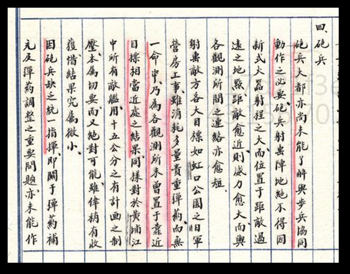 国军炮兵战斗的低下,也得到后来苏联炮兵顾问的证实,1938年,苏联顾问对驻西南的国军炮兵进行检查时,发现它们除了伪装做得好之外,射击水平极低,就算直瞄射击也打不准,间接射击、夜间射击就更打不准,炮兵营搞个射击准备,花了四个半小时,测地得出的数据误差,还高达25%-30%: