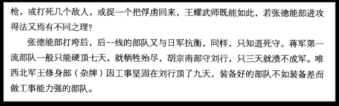 从整个山西战场来看,只有三件事让德国顾问满意,一是在卫立煌的指挥活泼、勇敢,不但手下的中央军表现出色,也把一部分晋军也带动得“略有勇气”;第二是晋军的一百多门大炮效率很高,在山西北部的战斗中鹤立鸡群,功不可没;第三,第18集团军有“特殊力量”、指挥优秀、官兵勇敢,可惜装备太差,只能在夜间和山地袭击日军后方。由于西安事变后蒋公夸下海口,说红军改编后归他本人亲自指挥,所以四舍五入,我们这伙八路当时也算中央军,优秀的表现给蒋公嫡系平均了一下。