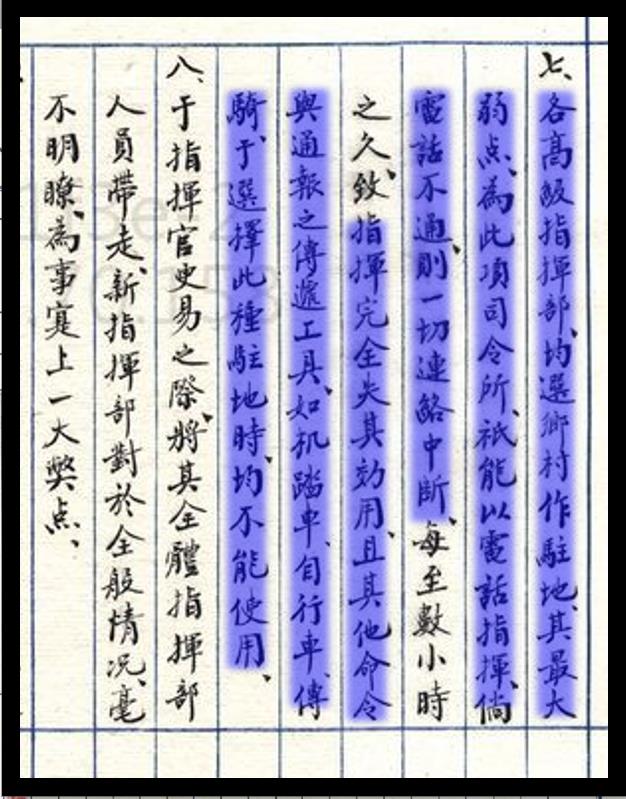 由于会战已经打了两个月,长官们吃不了野外搭帐篷的苦,也因为怕挨炸,不敢靠近公路、铁路,大多把指挥部搬进了舒适、隐蔽的江南乡村,全靠电话和前线联系。他们倒是舒服了,但电话线一断,联络就要中断几个小时,而江南乡村的狭窄田埂,又无法让摩托车、自行车和骑马传令兵快速通行,因此指挥部经常失联,前线就越发混乱。
