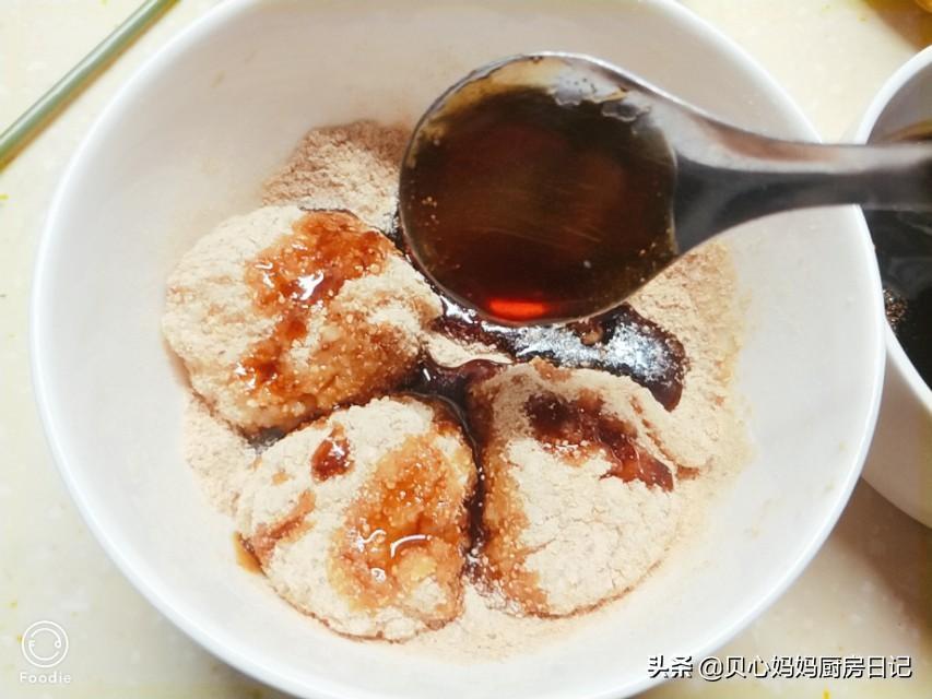 第七步:此时糯米应该蒸好了,取出用工具压一下,使其粘连在一起。用一个碗舀入两勺黄豆面,再用手捏几个糯米团放入碗中,滚动几圈。使其裹满豆粉,也可以找一个稍发大的容器,放入糯米团后,用力摇晃容器,使黄豆面裹住糯米团子,再淋上已准备好的红糖汁。就在完成了。