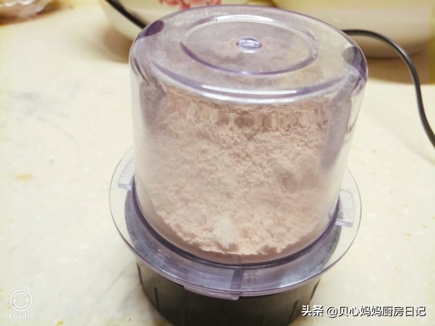 第五步:因黄豆外皮有水,刚开始需开大火,,再转小火。炒到颜色微黄,此时会满屋豆香味,味下也是享受呢。看到有些颗粒爆开就可以关火了,让余温继续烘烤,稍凉后放入料理机打成黄豆面,打好了,装入保鲜袋。(我家的打粉盒子很小,分三次才打完。)