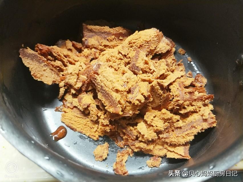第六步:开始准备红糖水,块状红糖切小,加入清水放入不粘锅里面。小火,用工具搅拌,直到变成浓稠的汁。