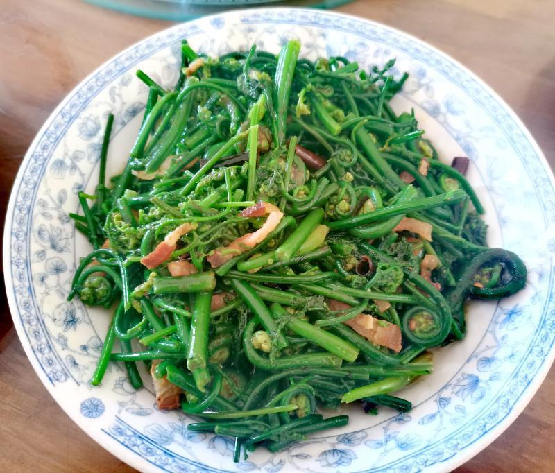箐蕨菜,蕨类水蕨科植物,又叫水蕨菜。含有丰富的蛋白质、碳水化合物、维生素矿物质,以及脂肪等多种营养成分。性味甘淡凉,具有活血解毒、止血止痛的功效。洗净、切段、腊肉火腿爆炒,素炒,吃起来生香爽脆。