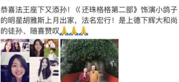 直到2018年11月,网上却突然爆出胡雅思剃度出家的照片。31岁的她剃掉秀发,成了上德下辉大和尚的徒孙,法号宏行。身穿红棕色僧衣,脸上未施粉黛,毕恭毕敬的和同门中人照了一张合影。可即便没有头发,她还像众人印象中那般貌美。