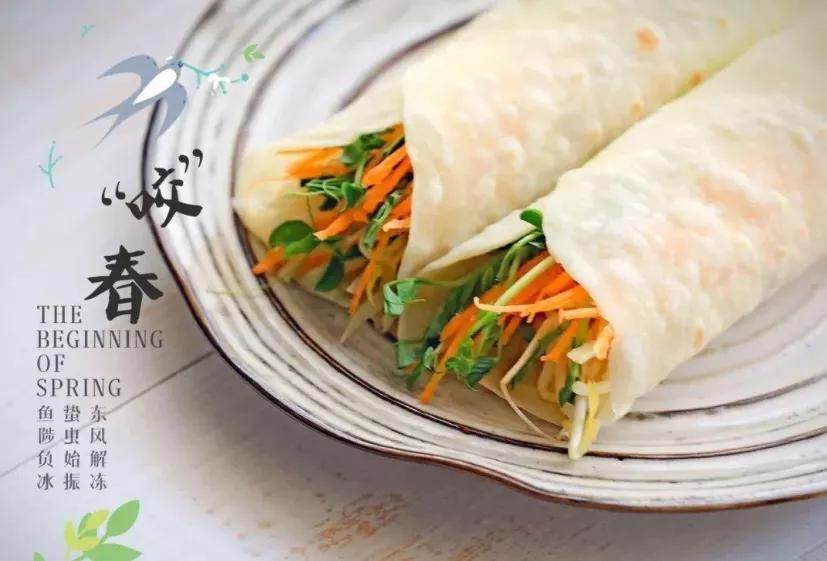 其实立春吃春饼的习俗起源于唐朝,也叫“咬春”。由于立春时,春回大地,万物复苏,各种蔬菜发出嫩芽,人们尝鲜,古人就用面皮包着时令蔬菜,卷成卷蒸熟或者油炸,取名春饼,寓意着五谷丰登,也是春天的象征,并将它互相赠送,取迎春之意。