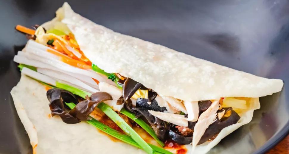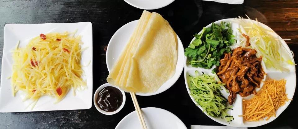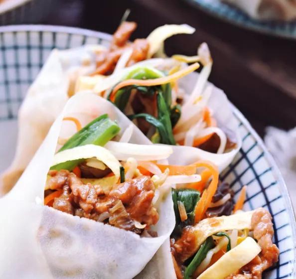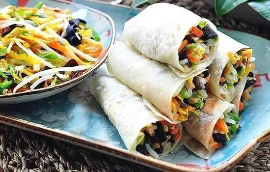 春饼主要是将面糊蒸或烤出来,卷上蔬菜,如葱丝、炒肉丝、炒豆芽、鸡蛋丝、黄瓜丝、胡萝卜丝等,再抹点酱料即可,口感清爽,饱腹感强。