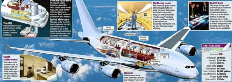 他拥有一架价值24亿美元的A380飞机,飞机内部可同时容纳几百人,各种娱乐设施、豪华套房应有尽有,甚至还有水族馆。