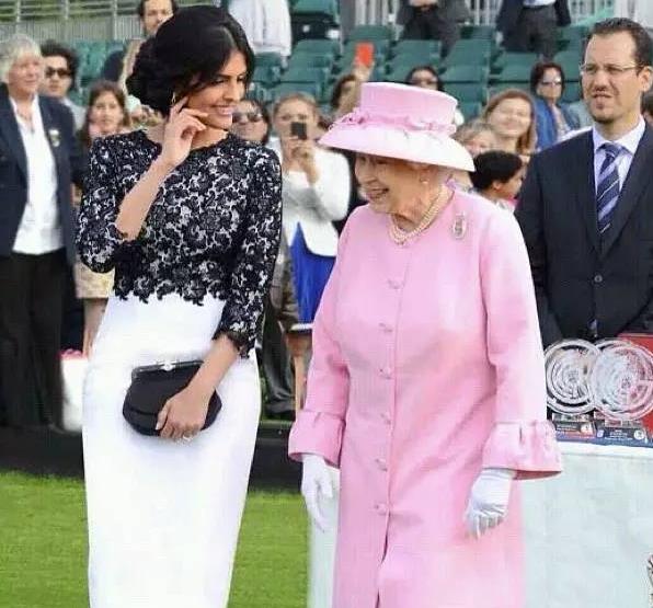 阿美娜与英女王一同出席活动,未戴面纱的阿美娜笑容灿烂。