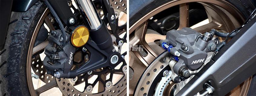 倒叉的出现让辐射卡钳的安装成为了可能,CB650R采用了NISSIN辐射式对向四活塞卡钳,后为单盘搭配NISSIN单活塞卡钳,刹车系统有着肉眼可见的升级。