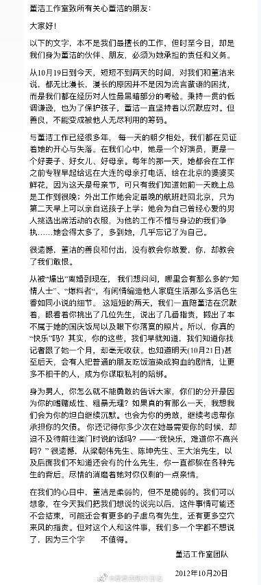 在分手消息传播开来后,董洁工作室首先声明,是潘嗜赌成性,人品败坏,所以分开。