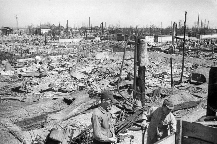 1945年5月9日夜间,300多架B一29轰炸机再次光临东京,每架携带6吨燃烧弹,低空沿东京东隅田河飞行,轮番轰击两个半小时,将炸弹全部扔在居民密集区,56平方公里面积地面上的一切被彻底烧光。飞机在250公里外太平洋上仍可看到冲天火光。有几处大火燃烧4天才慢慢熄灭。几万死难者都是因为燃烧耗尽氧气而窒息死亡,尤以低洼区最为悲东京大轰炸后的东京市区惨,着火、缺氧者争相跳入河中求生,结果隅田河漂满如木炭一样黑的尸体。人们争相躲入坚固的明治座剧院,院内窒息而死的尸体互叠有2米之高。当时日本本土空军和防空军已被摧毁,美国飞机如入无人之境;再加留京的政府医务人员仅剩9名医生、11名护士,完全丧失了救护能力。