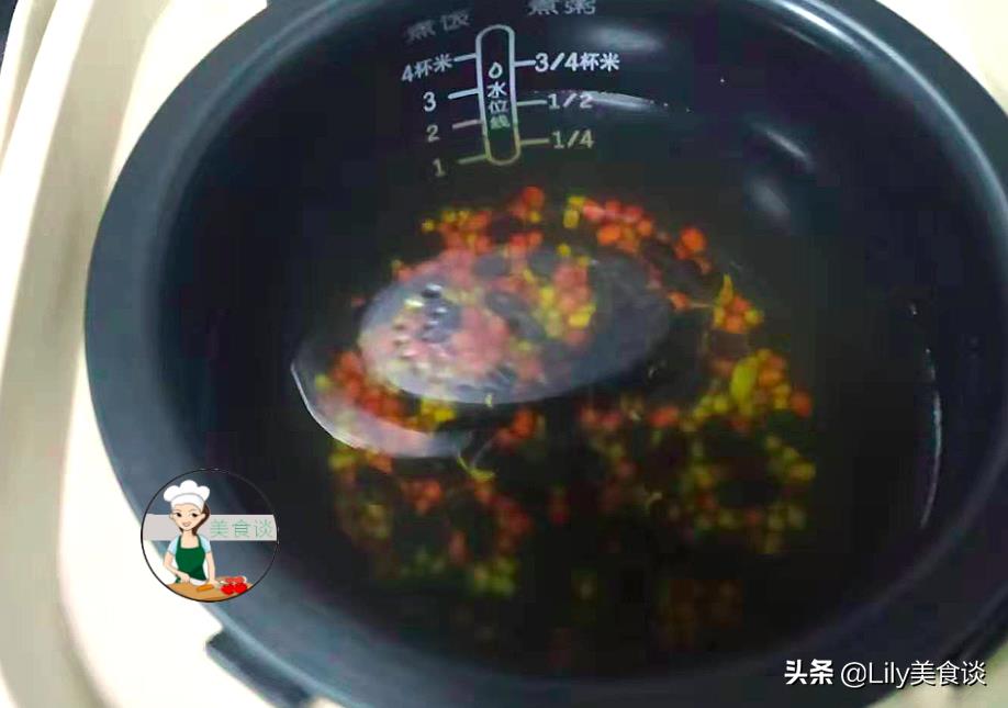3、把泡发的三豆和泡豆汤一起倒入电饭锅里,水不够再添加适量的清水。