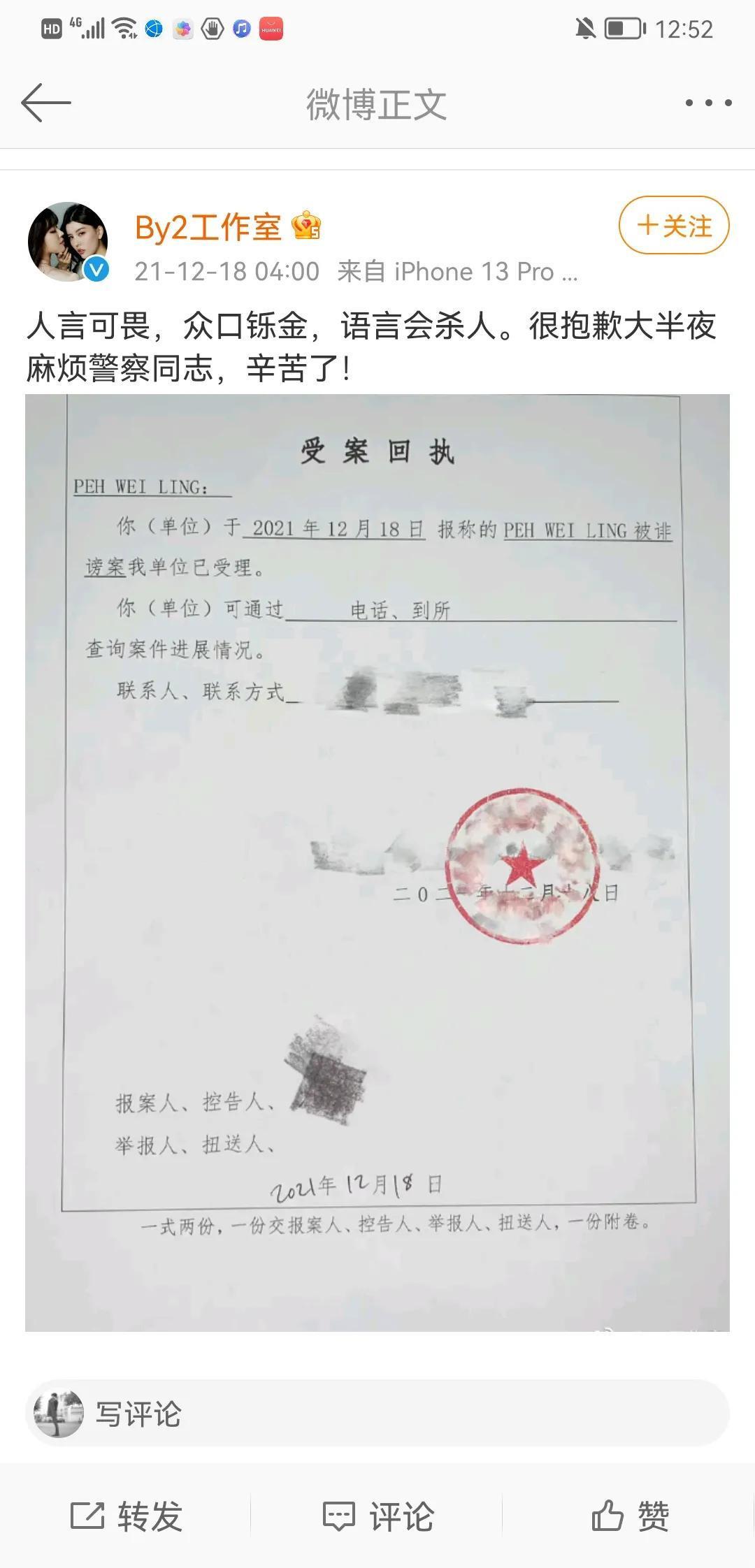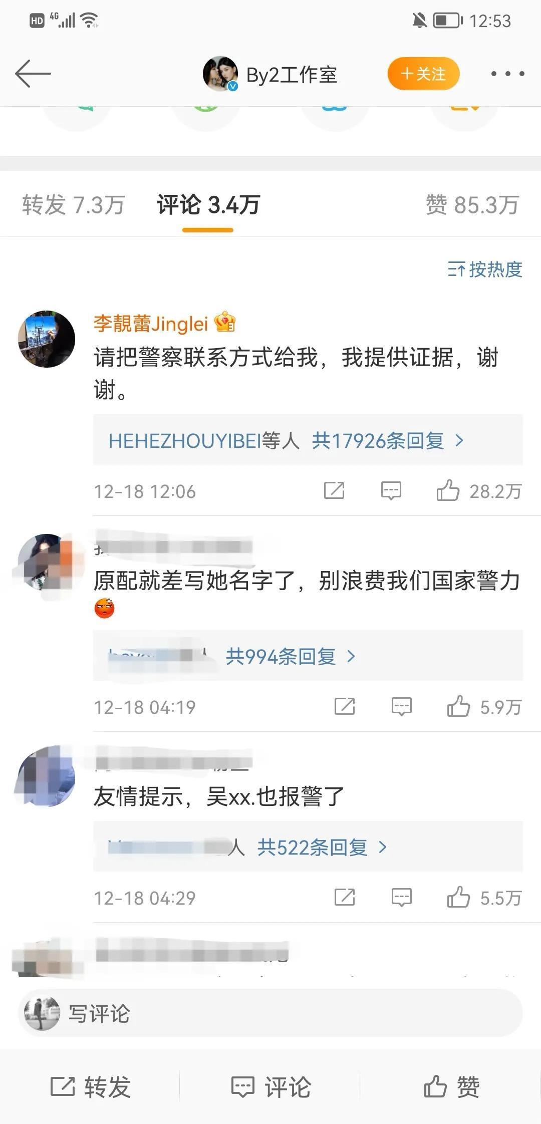 by2微博发出报警回执,李靓蕾底下回复要警察联系方式并提供证据