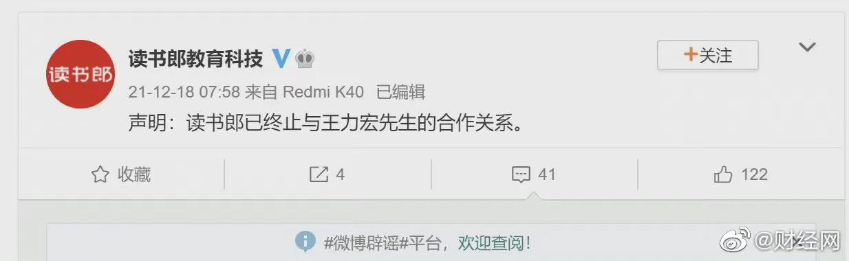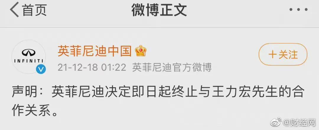 李靓蕾发长文后,王力宏的几个广告品牌更是刻不容缓发出解约声明,最快的是英菲尼迪,不到24小时就解约,网友笑评这是日抛式代言。另外还有周大生珠宝和读书郎也发了解约声明。后续肯定还有一大波解约。