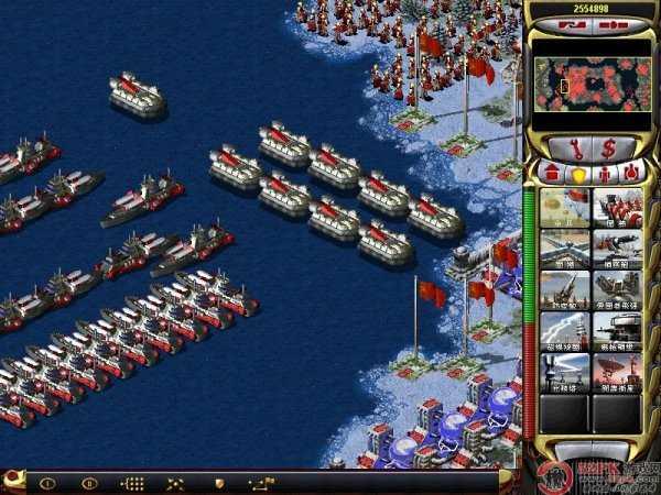 在游戏中当敌人与你隔海相望的时候,我们又不想用海军去攻击他们。此时装甲运兵船成为我们的必备利器,装甲运兵船没有任何战斗力只是一款单纯的运输单位,拥有较厚的护甲,很多有经验的玩家往往会使用装甲运兵船充当肉盾带头冲锋或者是在船里面放上4辆自爆卡车,运到敌人基地里面来一个两开花,反正玩法很多花招百出,我就无聊到出了十几艘装甲运兵船装满坦克模拟登陆战打电脑玩。
