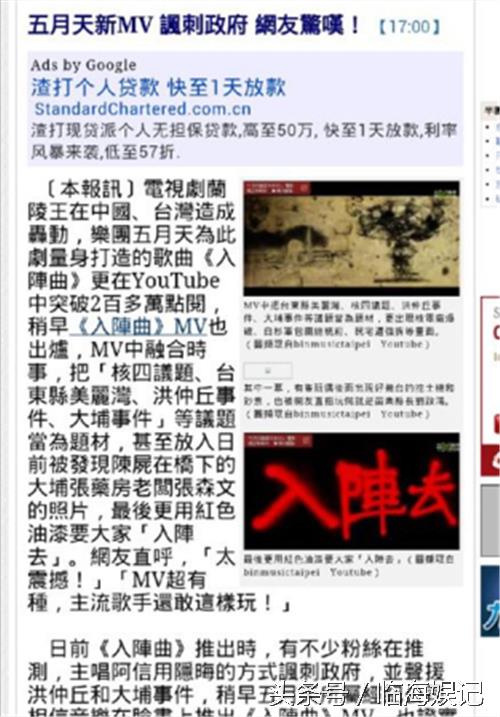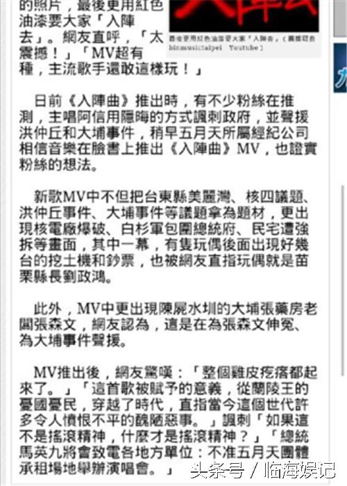 “……入阵曲 伴我无悔的狂妄,当一份真相 ,只手能隐藏,直到人们遗忘,写一页莽撞 我们的篇章……”正如歌词中所唱的,当时五月天的那一首《入阵曲》MV中所剪辑的穿插着的无不反映出一件件人们想要表达却无法表达的呐喊。可能由于话题过于敏感,这首《入阵曲》MV立刻遭到了禁播。