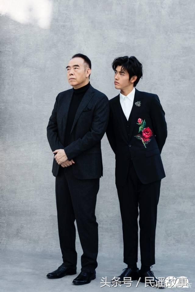 在陈凯歌父子的这组大片中,二人都身着黑色西装,相当有型。17岁的陈飞宇已经有1米88的个头,非常帅气。
