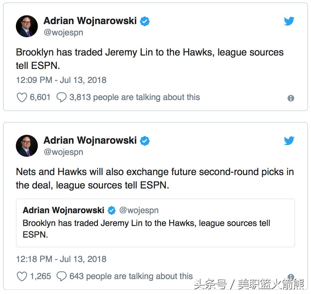 沃伊纳洛夫斯基报道林书豪被交易的推特