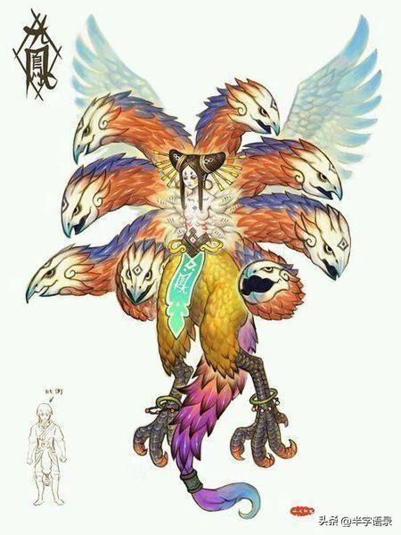《山海经·大荒北经》中说:'大荒之中,有山名曰北极柜。海水北注焉。有神九首,人面鸟身,句曰九凤'。