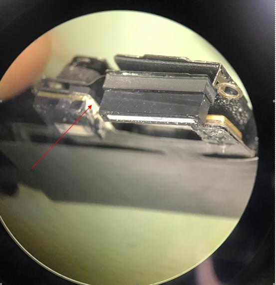 测试中发现,不扣听筒排线就开机电流正常,拆下机子,拿下听筒排线,发现听筒排线进水腐蚀。