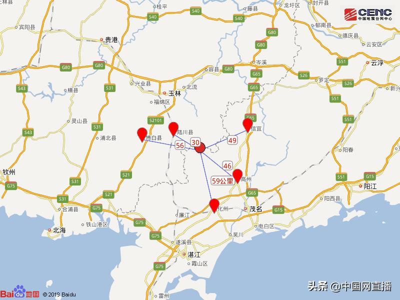 周边县城:震中距陆川县30公里、距广东高州市46公里、距广东信宜市49公里、距博白县56公里、距广东化州市59公里,距玉林市63公里,距南宁市235公里。