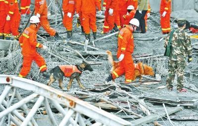 24日,救援人员和搜救犬在事故现场展开搜救。新华社