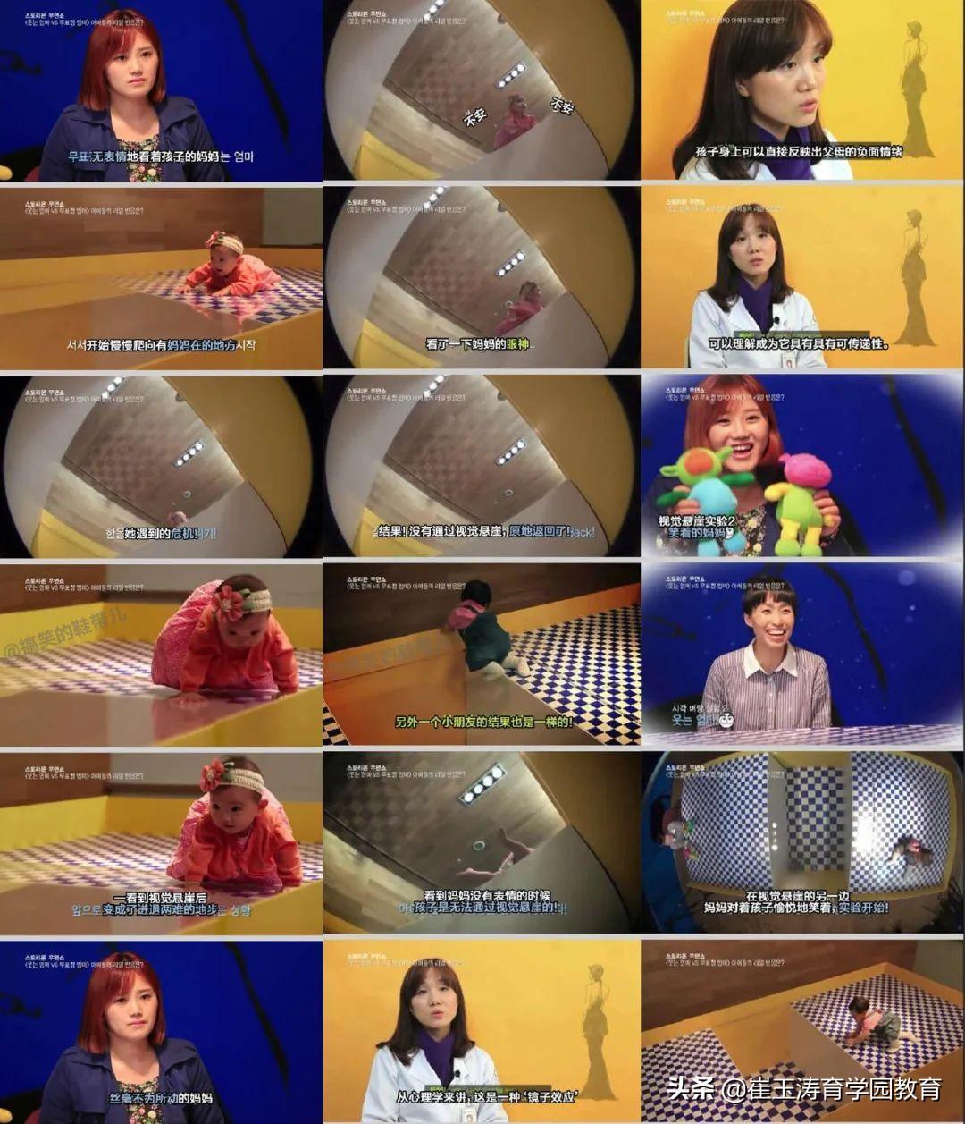 例如,宝宝在9个月的时候开始形成理解或者解释成人面部表情的能力,婴儿常会将母亲的面部表情作为情绪信息,母亲愤怒,他也会愤怒;母亲愉悦,他也会开心。韩国一档亲子节目做过一个“视觉悬崖”实验。