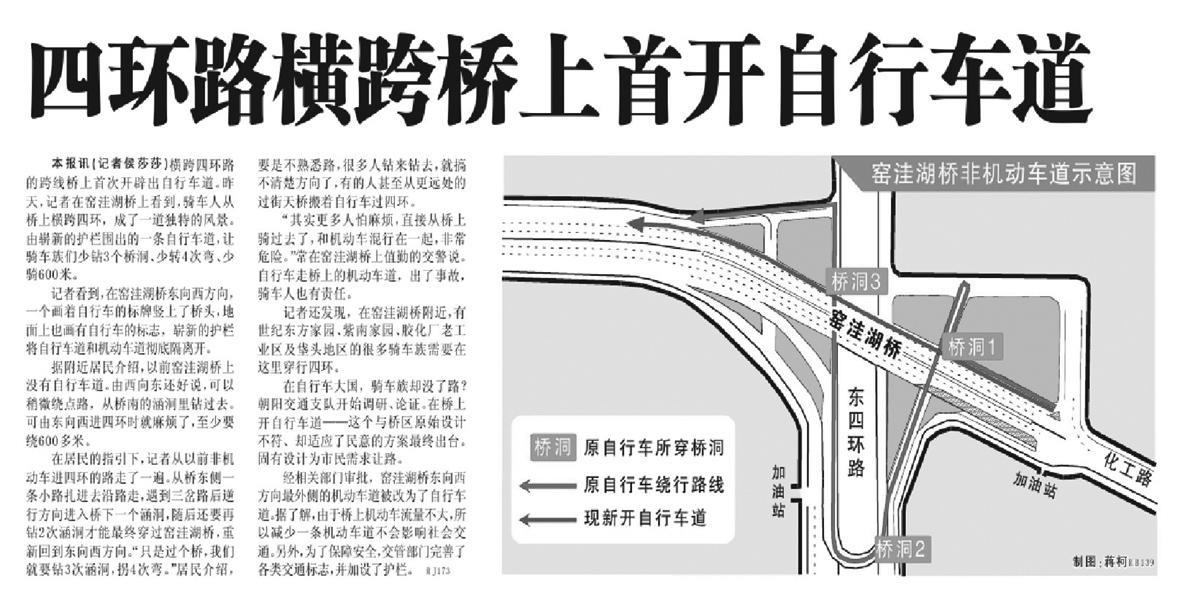 2007年11月14日,《北京日报》8版,《四环路横跨桥上首开自行车道》