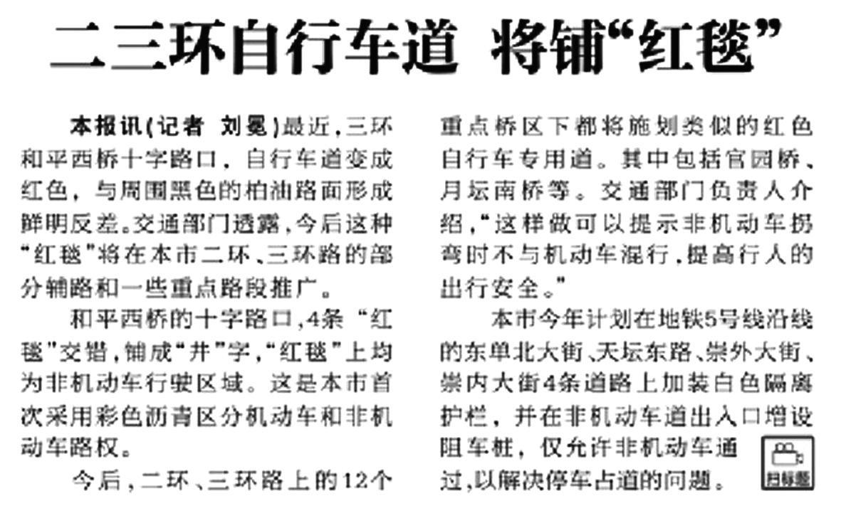 2013年8月17日,《北京日报》5版,《二三环自行车道将铺“红毯”》