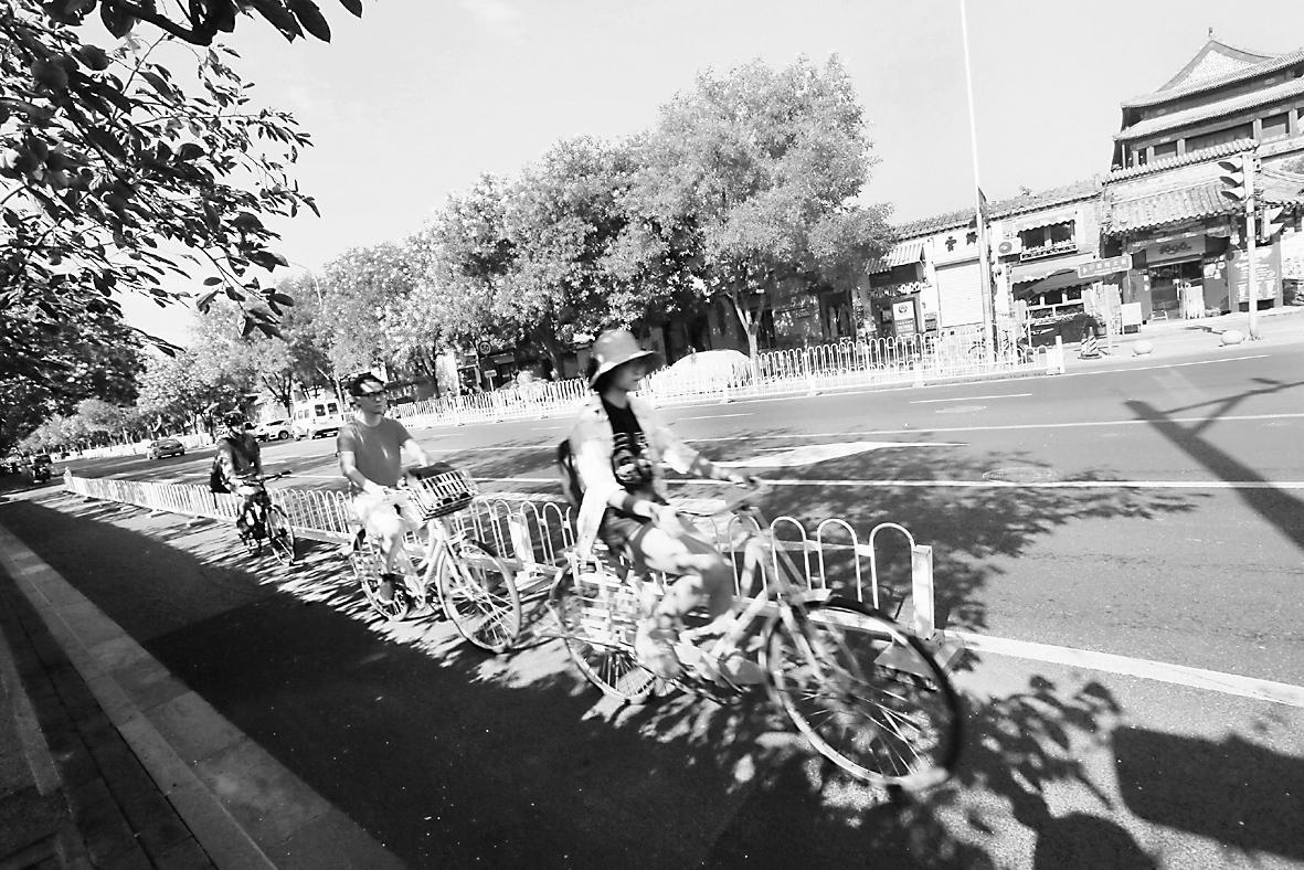 2016年7月,游客在彩色自行车道铺装的旧鼓楼大街骑行、游玩。孙戉/摄
