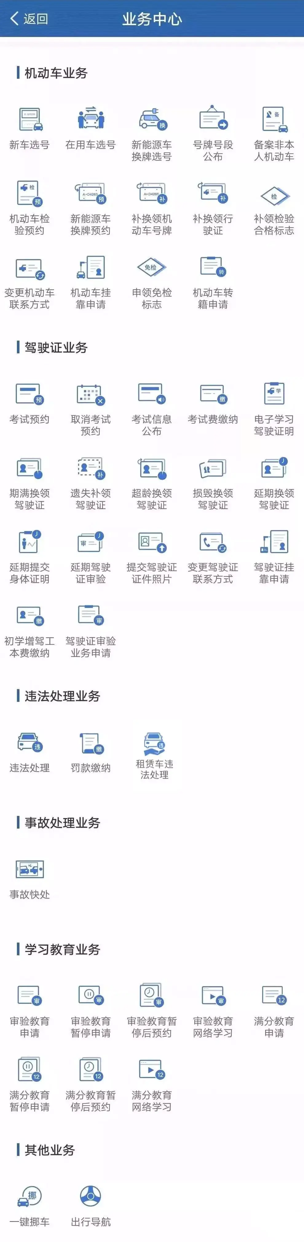 目前,“交管12123”为互联网平台个人注册用户提供全国范围内交通安全服务功能。主要服务内容包括:1、交通安全信息查询:机动车、驾驶证、道路交通违法信息查询告知及交通安全信息提醒等。2、交管业务预约/受理/办理:机动车选号、补换领机动车号牌、补换领机动车行驶证、补领机动车检验合格标志、申领免检标志、提交驾驶证照片、期满换证、损毁换证、遗失补证、超龄换证、考试预约、取消考试预约、考试费缴纳、延期换证、延期审验、延期提交身体条件证明、交通违法处理、罚款缴纳、事故快处、一键挪车、备案非本人机动车等。3、服务指南:交管业务服务指南、交管资讯、办事网点、出行导航、常见问题解答、业务指南、意见反馈等。4、用户信息管理:个人信息维护、备案机动车、备案驾驶证、网办进度、邮寄地址维护、登录密码修改、手势密码修改、删除用户、暂停用户、用户申诉等。