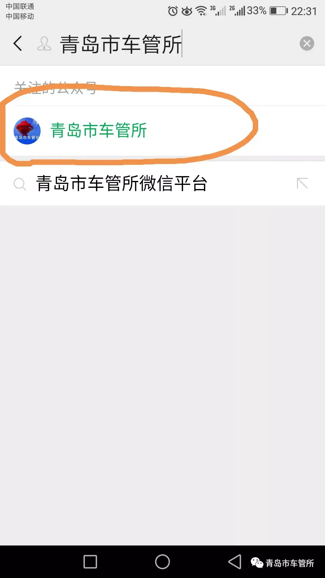 3、进入青岛市车管所公众号,点关注。