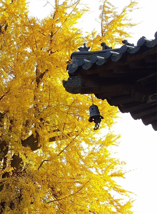 银杏霜风吹过,黄叶如蝶飘落。走上小石桥,满满一湖金色。