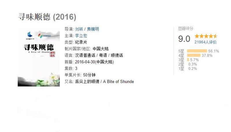 《寻味顺德》是由刘硕、费牖明联合执导,拍摄于2016年。该纪录片一共有3集,每集时长50分钟。在拍摄这部纪录片时,摄制组走遍了顺德的大街小巷,总共积累了36000分钟的原始素材,最终精剪出150分钟,是一部非常值得观看的美食纪录片。