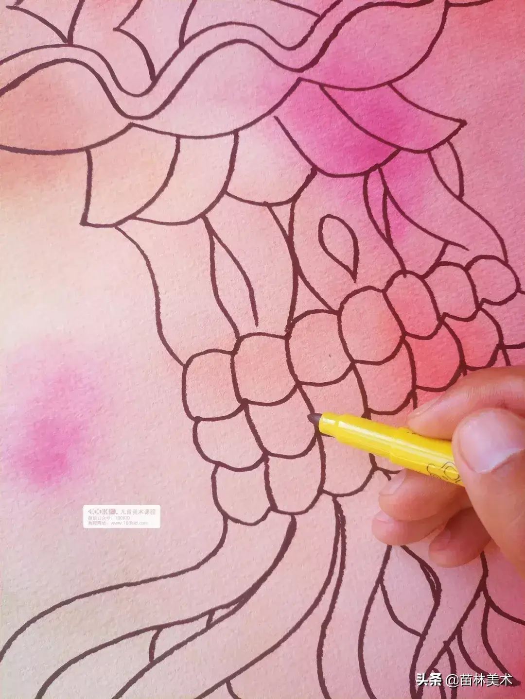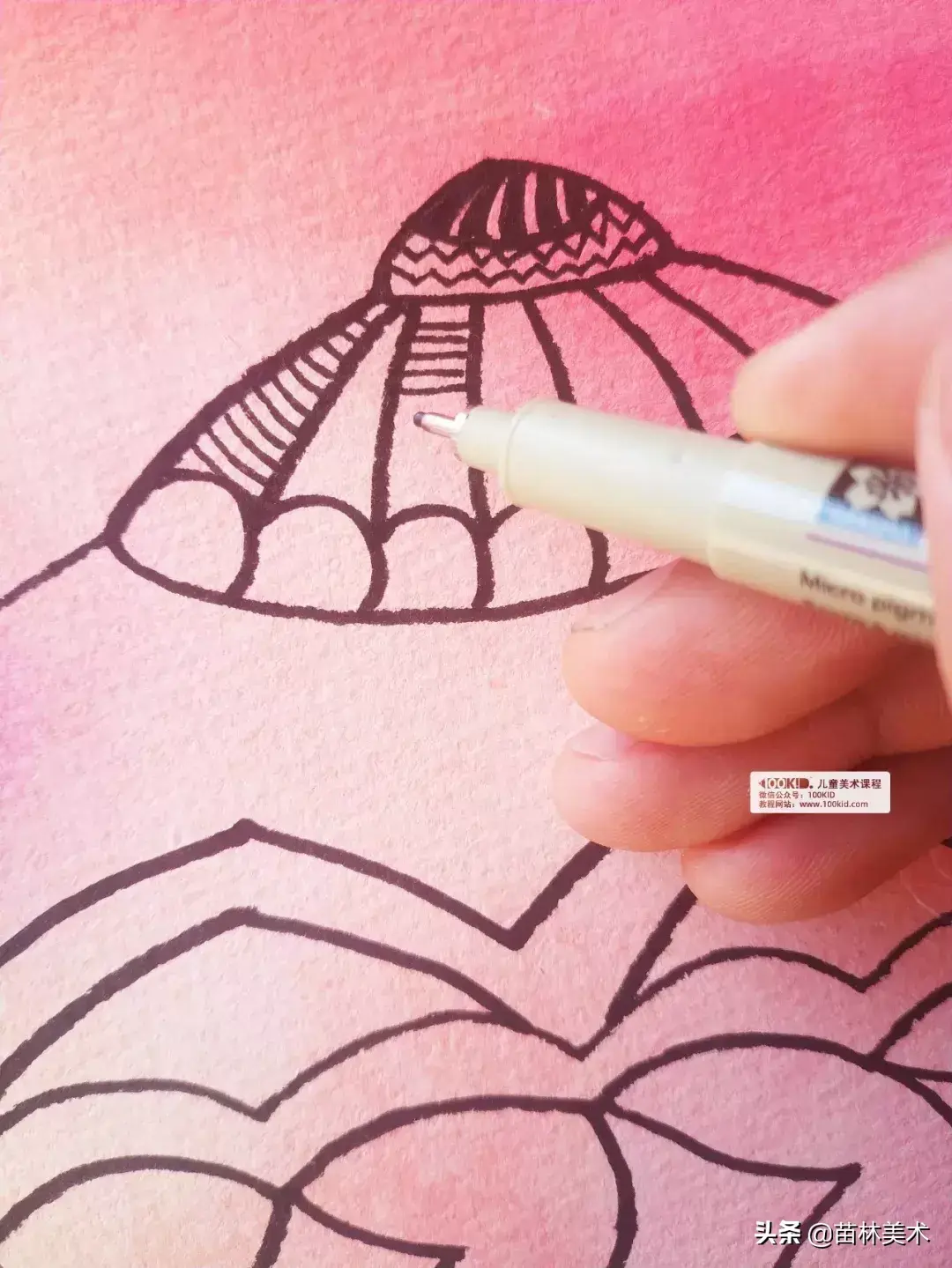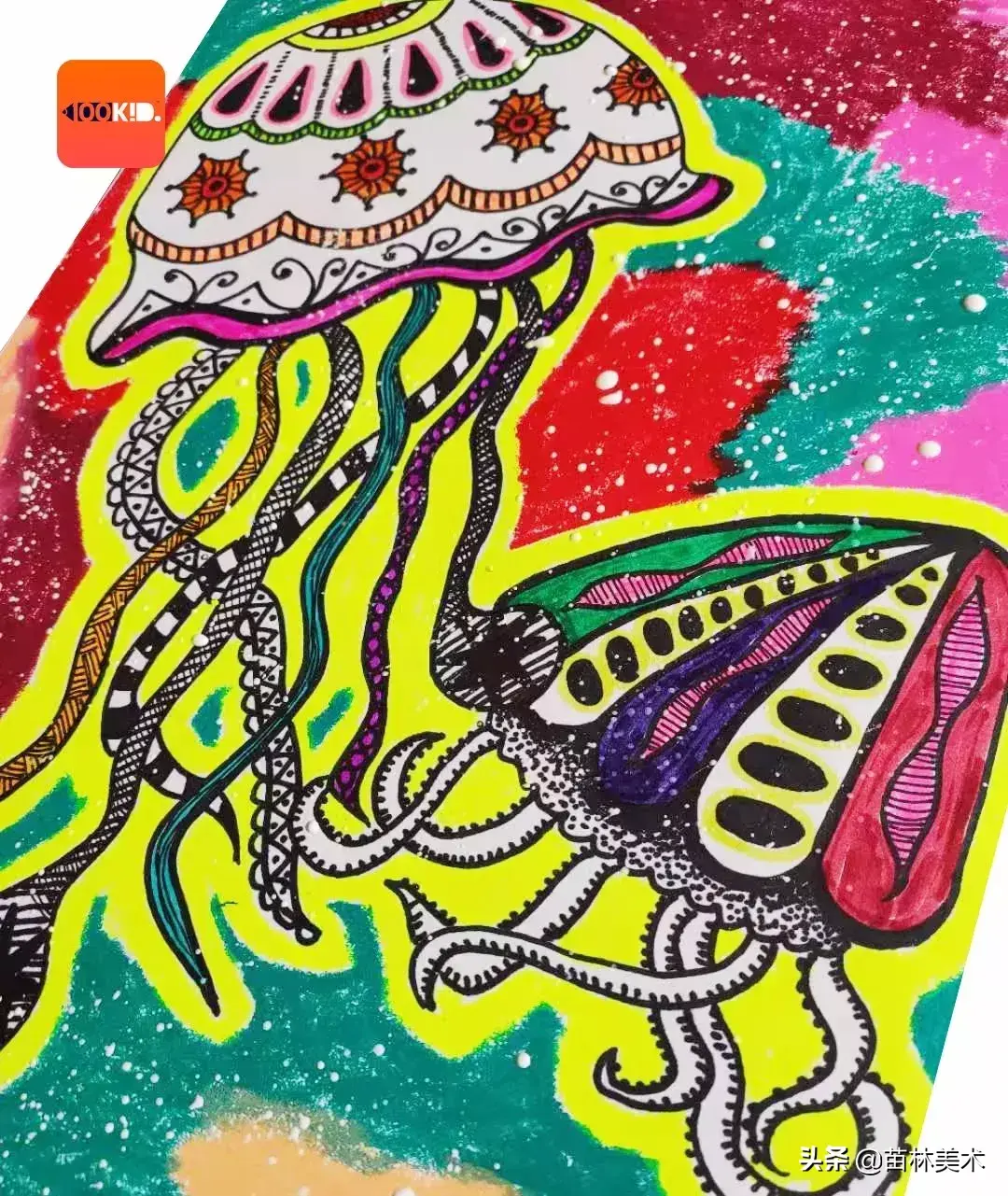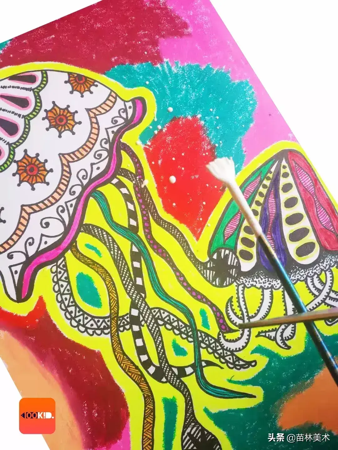 第二,用勾线笔,在刚刚的背景纸上画出水母的外轮廓,注意画面线条的流畅性