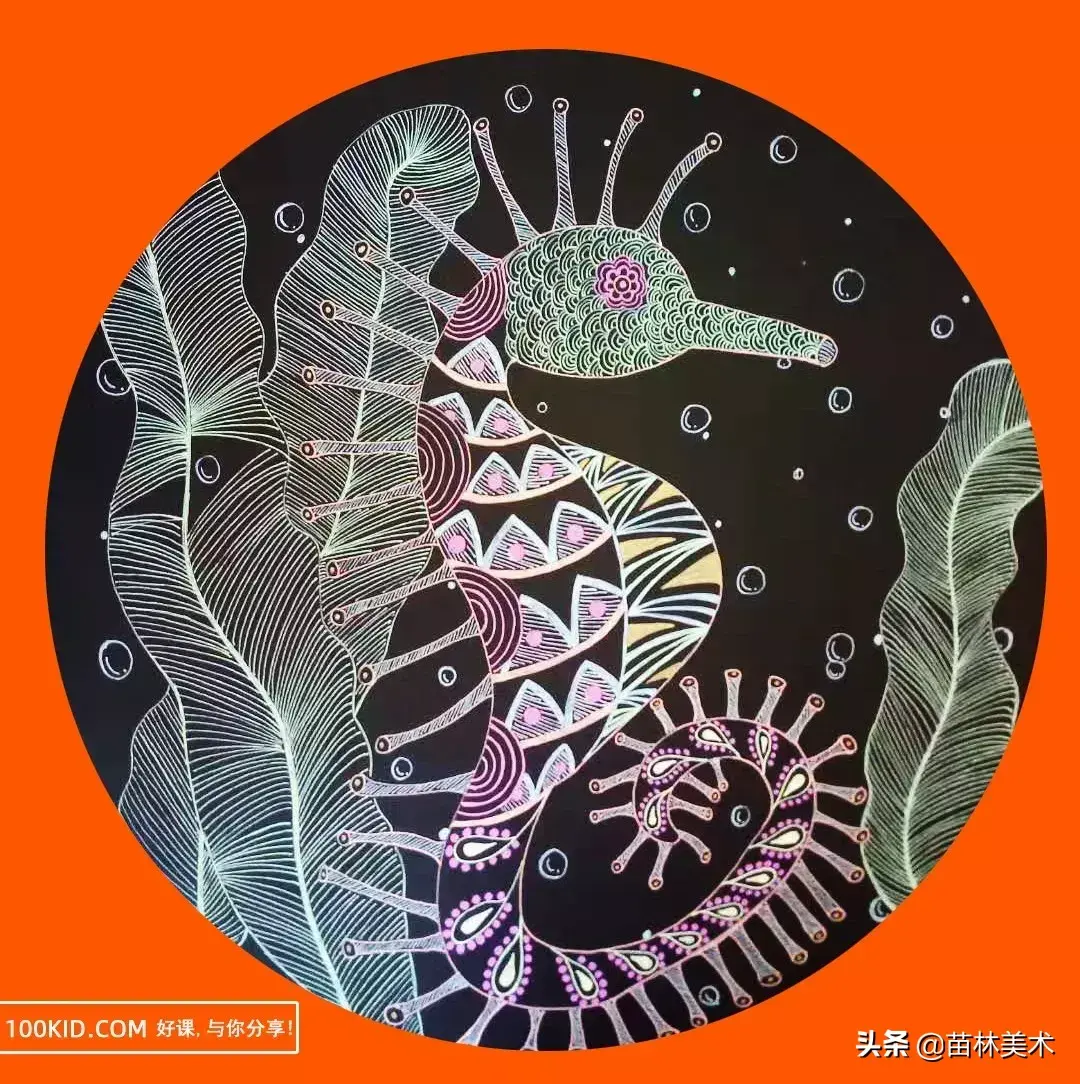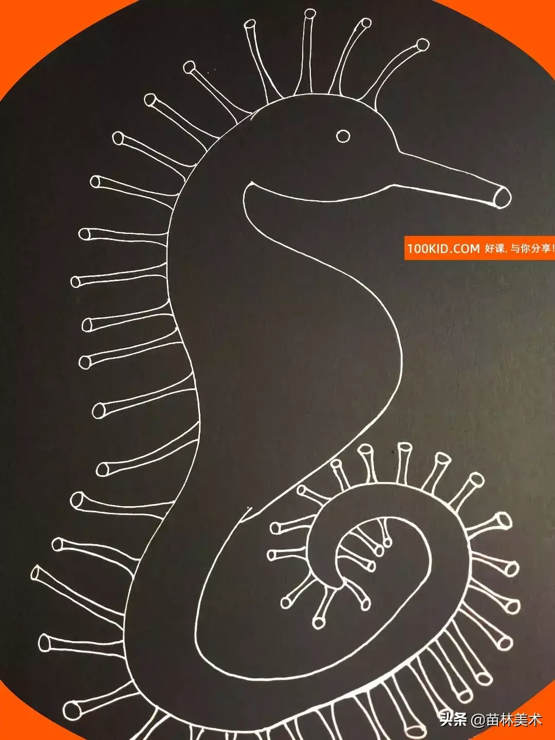 第一,在准备好的的黑色圆形卡纸上使用高光粉彩笔白色画出小海马的外轮廓,注意海马位置构图。