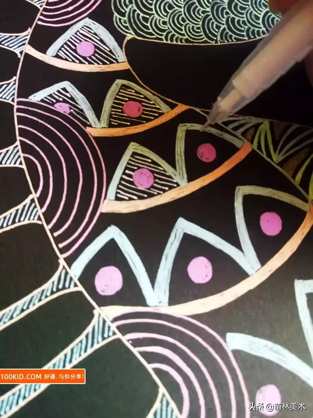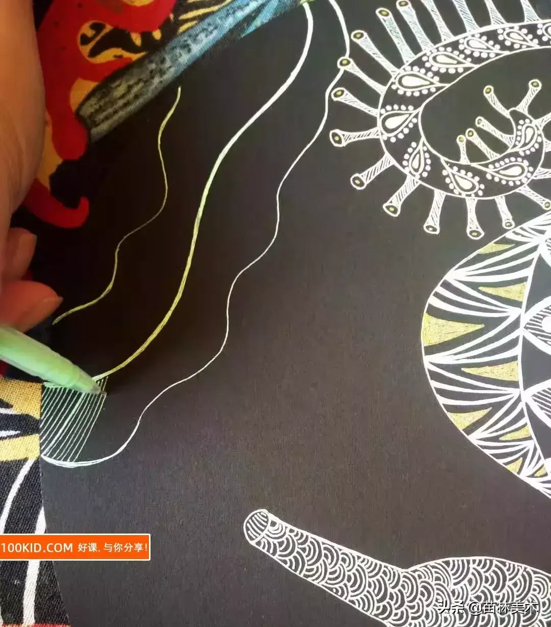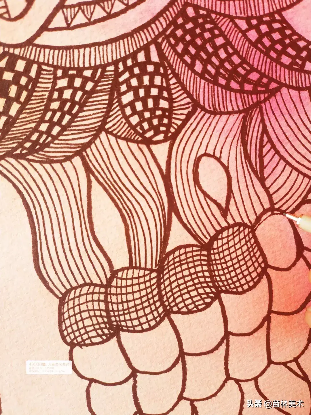 第四,用针管笔的细线条来绘画画面的疏密纹案图样,让画面更加饱满