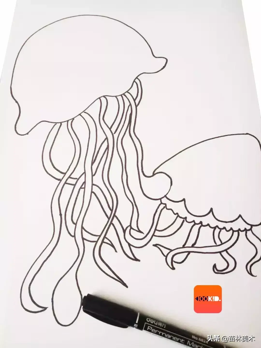 第一,在一张白卡纸上,用勾线笔画出水母外轮廓,两个水母位置错落。