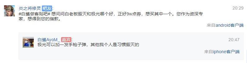 Q:想问问白老板毁灭和极光哪个好,正好9w点券,想买其中一个。您作为资深专家,想得到您的指教。