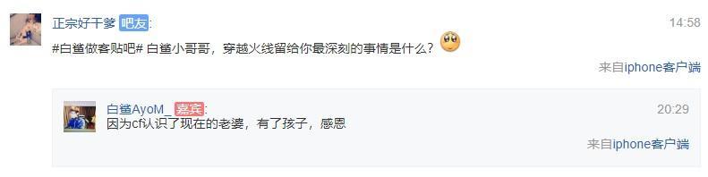 A:因为cf认识了现在的老婆,有了孩子,感恩