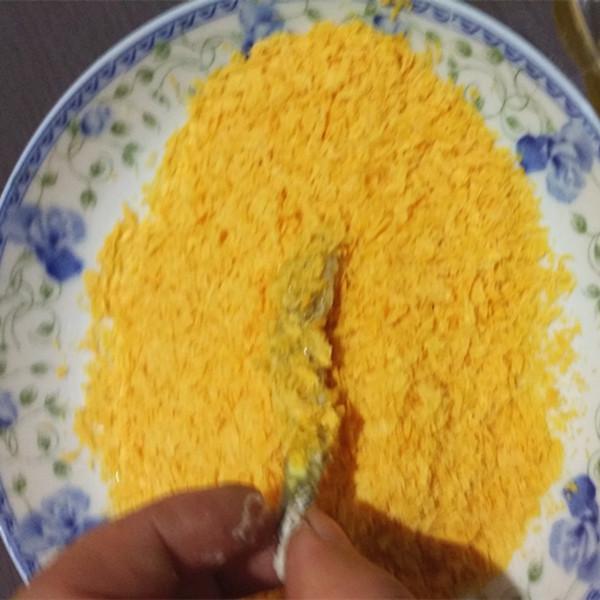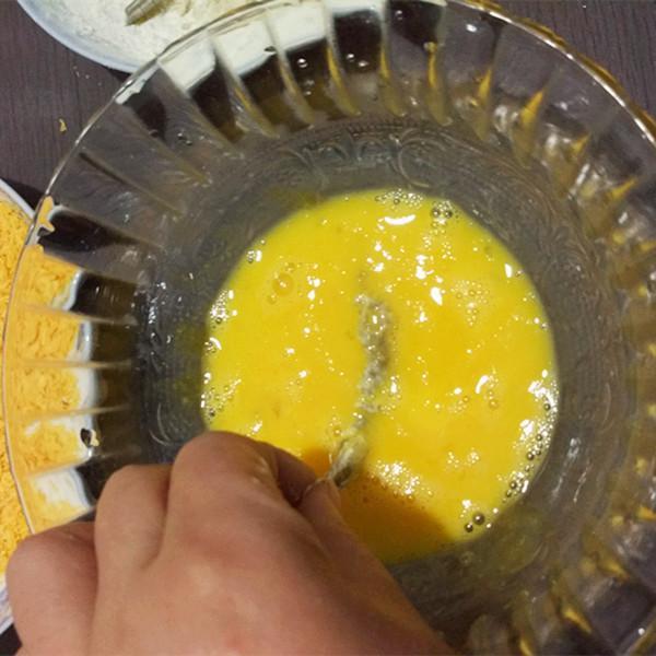 裹一层薄面粉抖一下,粘上鸡蛋液。
