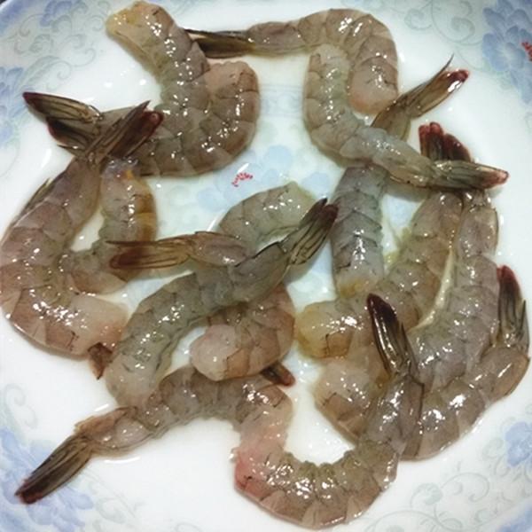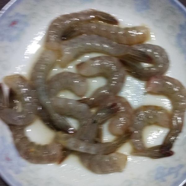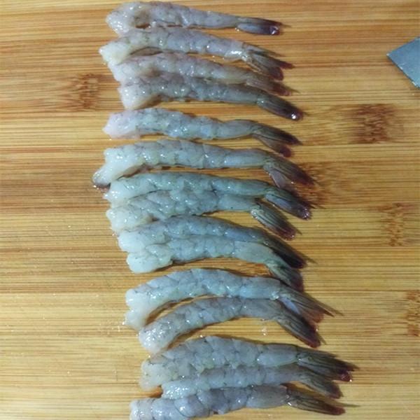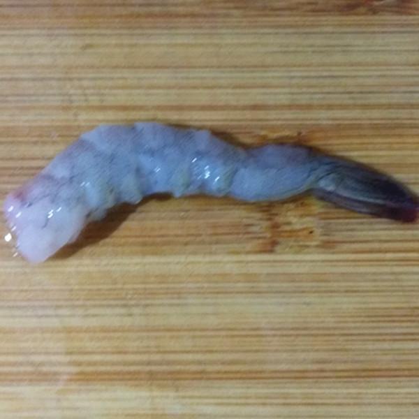 虾剥壳,去头时候轻轻一拉,虾肠子也一并拉出。尾部壳留着。