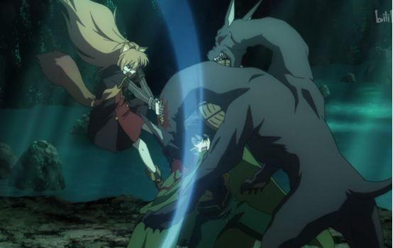 两人下矿在意料之中被一头15级的双头犬袭击,至于有人疑问为什么不用灵气盾,事实上很好懂,用了灵气盾虽然无伤但相对的拉芙塔莉雅很难命中双头犬,这样把伤害扛下来反而能够固定好对面的身体,哪怕是LV1也能够轻易把双头犬刺死。