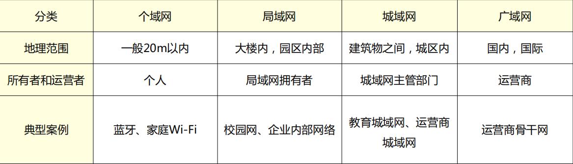 按照覆盖范围可以把网络分为个域网(PAN)、局域网(LAN) 、城域网(MAN)和广域网(WAN)。