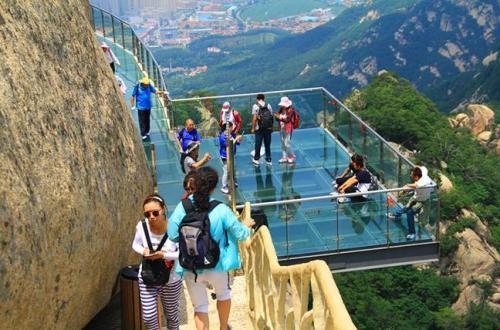 新修的玻璃观景台,是在1.5米宽的玻璃栈道基础上,在玻璃栈道尽头特别打造出的一个宽8米,向外悬挑4米的全玻璃观景台,共由26块玻璃组成,全部采用3厘米双层夹胶钢化玻璃铺设。