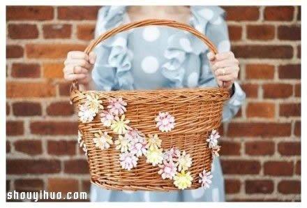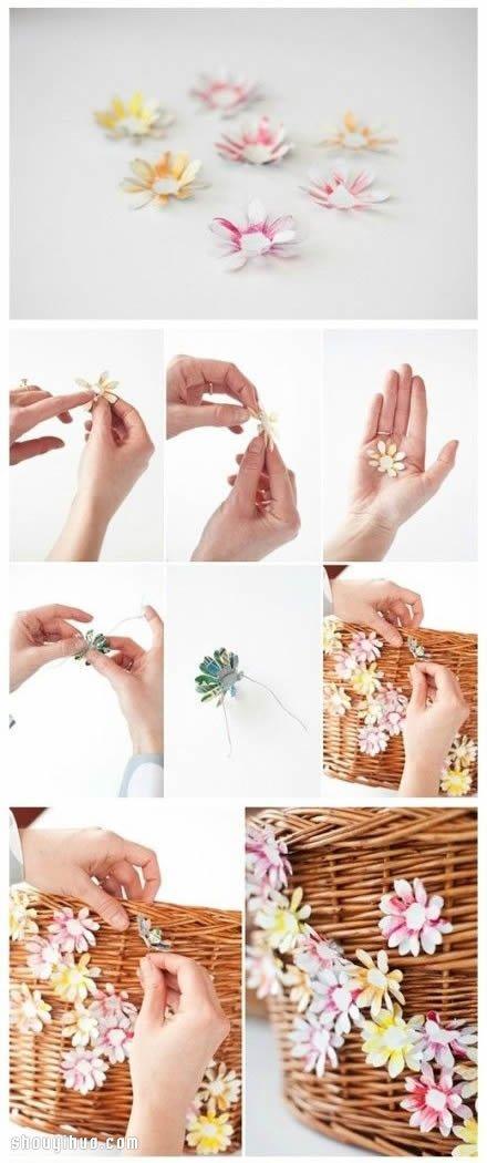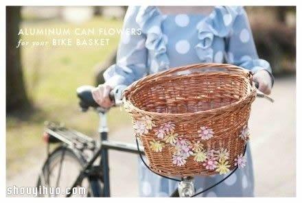 将制作完成的花朵用铁丝固定到竹编筐上,一个漂亮的田园风车筐就DIY完成了,特别适合喜爱骑自行车的女生呢!这款易拉罐手工花车筐的详细制作过程,请看下面的图解。心动就赶快来行动吧~~~