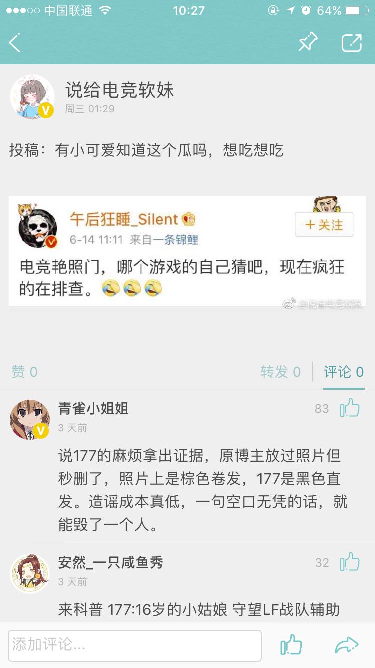 在众人都猜测他说艳照门女主是谁的时候,他提供了几个线索“守望先锋”“数字”“女选手”,矛头直指177。177是LF战队现役选手,是队里唯一的女选手,16岁。